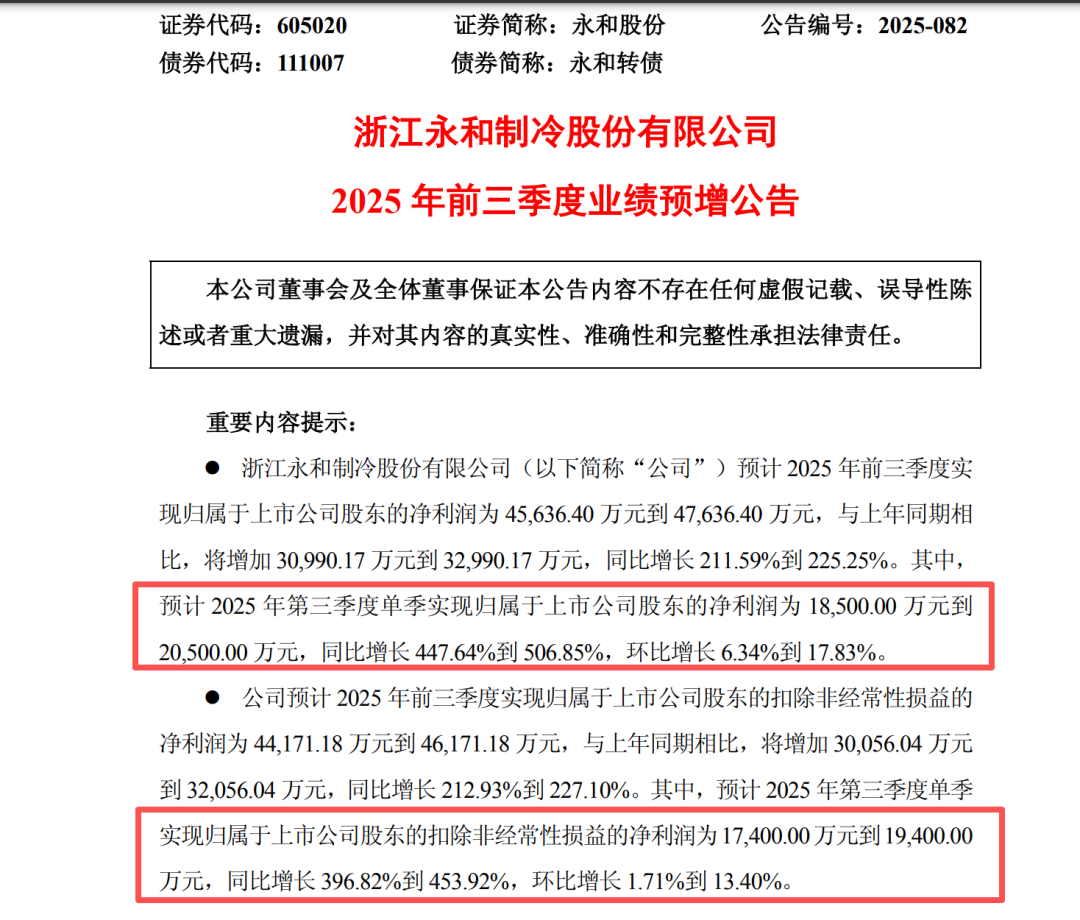 10月8日晚间,永和股份发布2025年前三季度业绩预增公告。公司预计前三季度实现归母净利润4.56亿元至4.76亿元,同比增长211.59%至225.25%。
