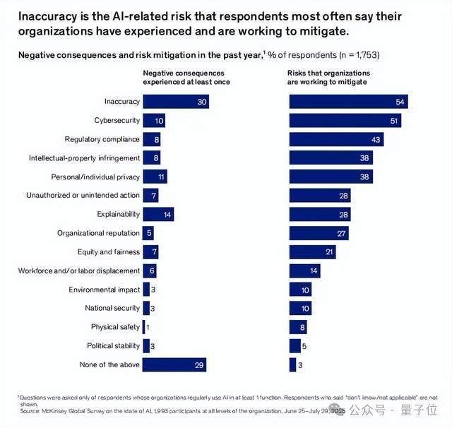 麦肯锡的调研显示,在所有AI相关的负面后果中,“结果不准确”是企业遇到最多的问题,有30%的组织在过去一年中至少遇到过一次该类风险。其次是“解释性不足”和“个人隐私问题”。