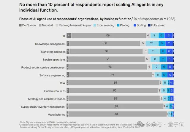 更关键的是:在任何一个部门里,真正在推AI Agent的公司,都不到一成。
