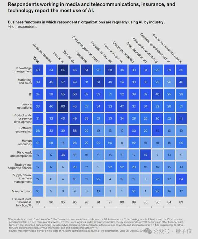 麦肯锡这份《The State of AI in 2025》调查了全球来自各行业的近2000家组织,其中一个最直观的数字是: