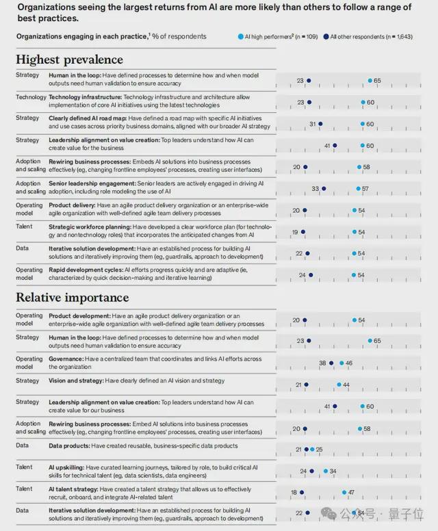比如,在战略层面,高绩效企业中有60%已绘制明确的AI路线图(一般企业的一半)。
