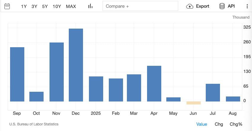 美国就业下降、通胀上升。当地时间9月5日,美国劳工部统计局公布了最新的就业数据,8月份非农就业人数增加2.2万,远低于预期的7.5万,
