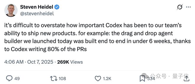 OpenAI研究员Steven Heidel在X上透露,最新发布的Agent Builder不到6周就完成了端到端构建,而Codex编写了80%的PR