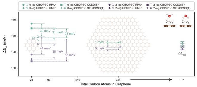 消除模型局限,首次实现「握手」:在研究水分子吸附在石墨烯表面的体系时,SIE+CCSD(T) 首次让两种常见的模拟方式——开放性边界(OBC)与周期性边界(PBC)——在大体系下计算出一致结果。吸附能最终收敛至约100 meV,显示水分子在石墨烯上并没有明显的取向偏好。