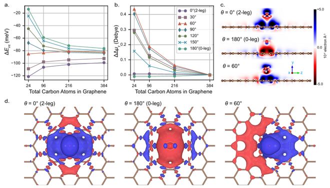 图a与b,使用SIE+CCSD计算得到的不同水分子取向构型的吸附能以及y轴方向的相对极化率。图c与d展示了2-leg、0-leg与60°三种构型的表面电子密度变化情况。不同旋转角度构型的吸附能都处在0-leg与2-leg之间,这意味着不同构型之间的吸附能差距不会超过 10 meV。