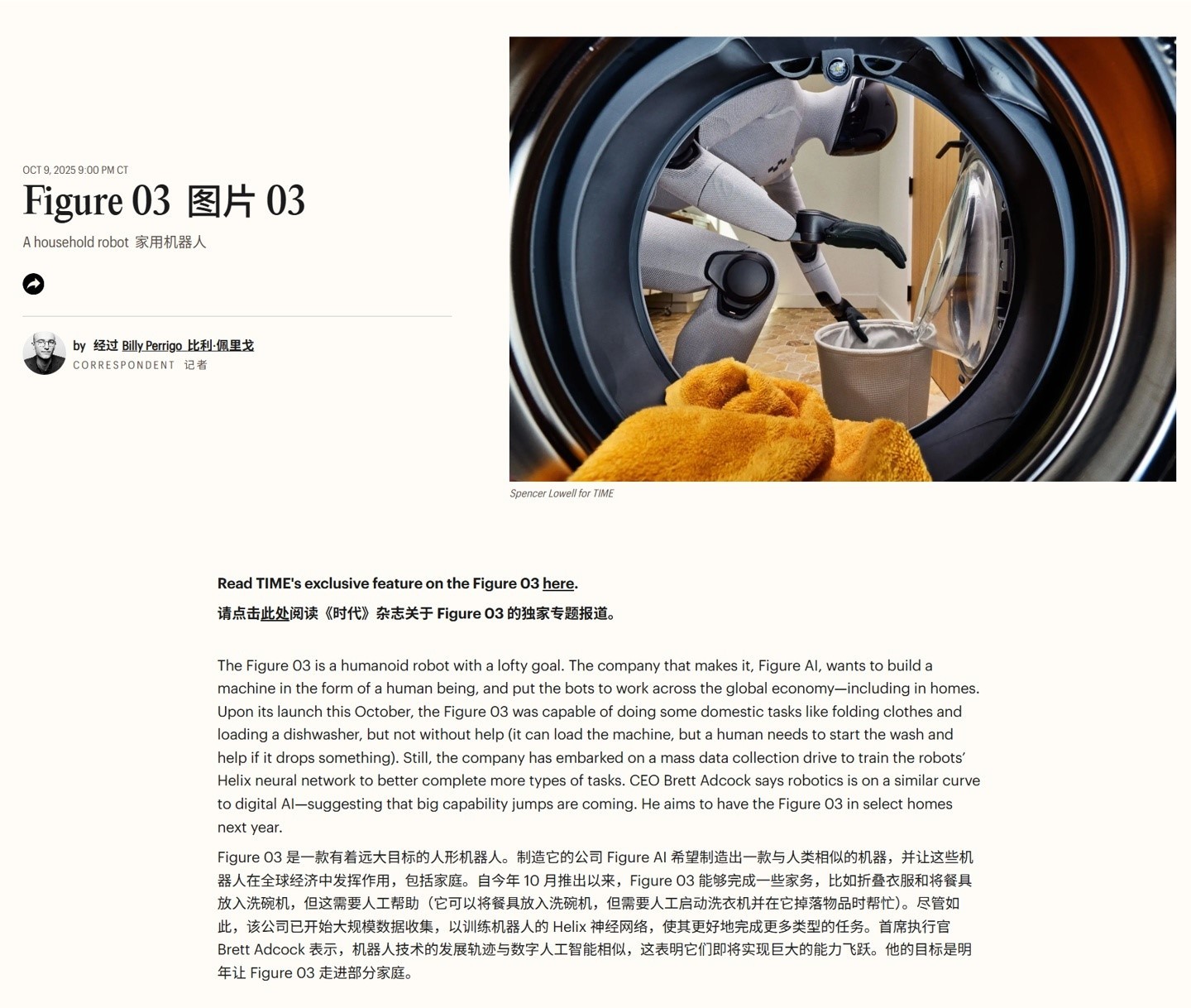 IT之家查询公开资料,发现 Figure 03 和 Unitree R1 等一起,入选为《时代》杂志 2025 年最具发明机器人榜单。