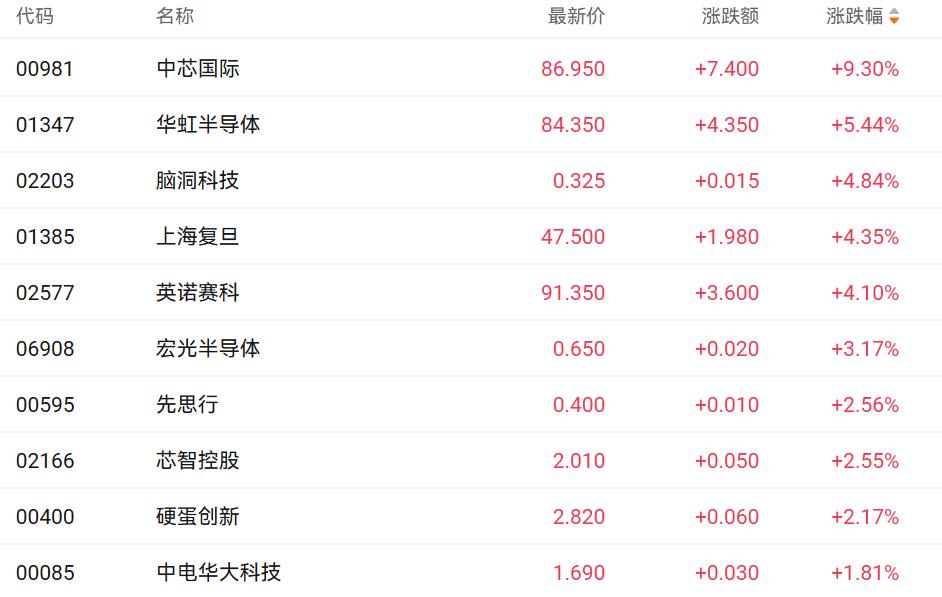 以半导体股为例,截至午盘,中芯国际(00981.HK)、华虹半导体(01347.HK)、上海复旦(01385.HK)分别上涨9.30%、5.44%、4.35%。