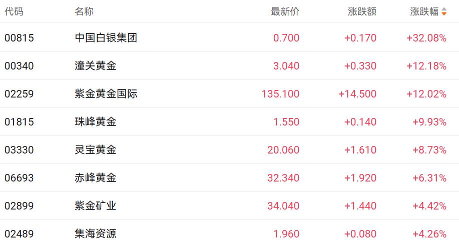 截至午盘,潼关黄金(00340.HK)、紫金黄金国际(02259.HK)、珠峰黄金(01815.HK)分别上涨12.18%、12.02%、9.93%。