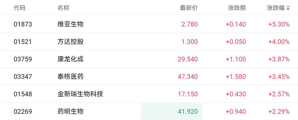 截至午盘,维亚生物(01873.HK)、方达控股(01521.HK)、康龙化成(03759.HK)分别上涨5.30%、4%、3.87%。