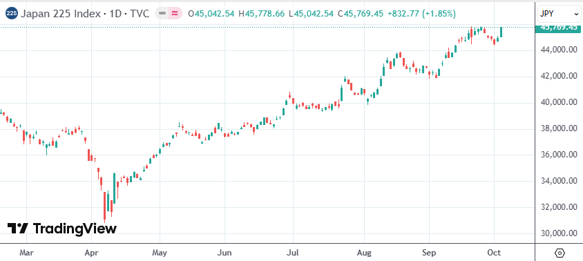 本周五,日经225指数收于45769.50点,刷新了前一周创下的历史收盘高位。
