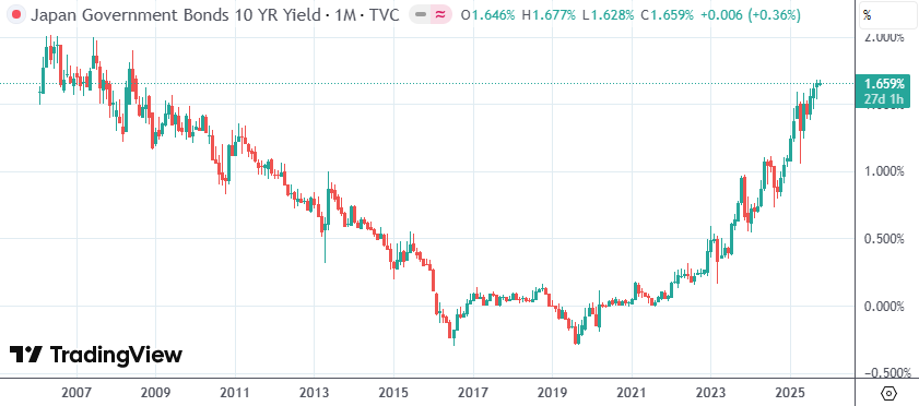 与此同时,日本10年期国债收益率周五涨近2个基点至1.668%,收于2008年7月以来的最高水平;30年期日债收益率也维持在高位附近。