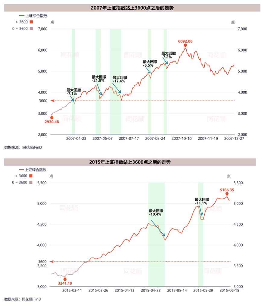 有机构统计了2007年之后,A股站上3600之后调整变化,没什么太多的规律性,但总归是涨多了要回调。