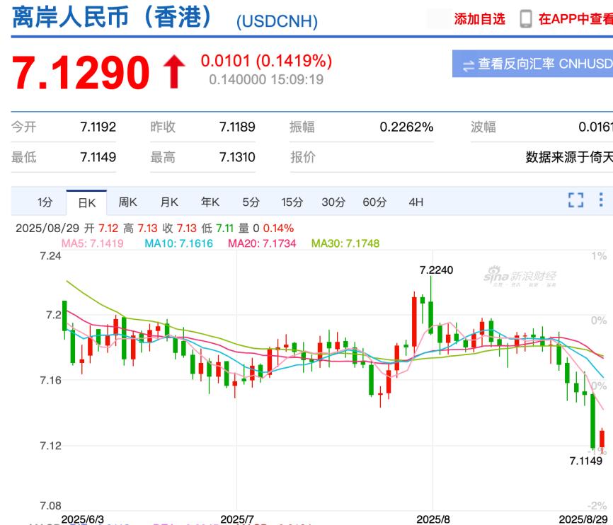 8月28日,离岸人民币价格突破7.15这一重要关口,直接拉到7.11附近。