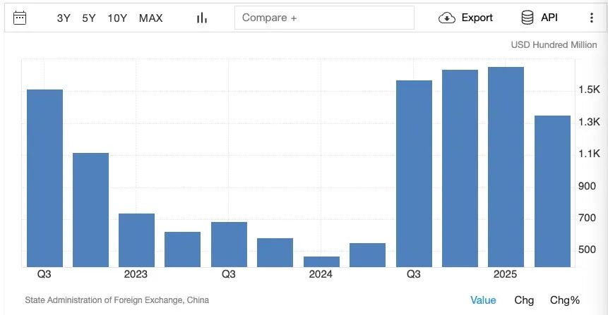 根据tradingeconomics的数据,中国的经常账户盈余在2025年第二季度激增至创纪录的1,351亿美元,大幅增长自去年同期的555亿美元,中国出口自1981年至2025年平均为92.35亿美元,2025年2月达到历史最高点539.94亿美元。