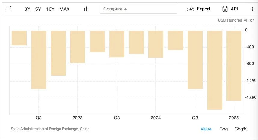 我们也有弱项,看看资本流动,2025年第一季度,中国资本和金融账户出现1656亿美元的赤字。
