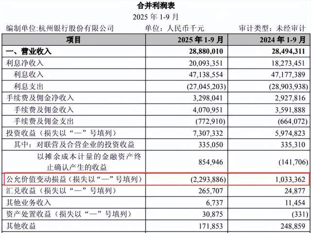 这种现象并非杭州银行独有,实际上在A股上市银行中,前三季度有大部分银行公允价值变动收益为负值,在17家上市城商行中,更是有16家为负值,杭州银行在该项目上的亏损金额排在第二位。