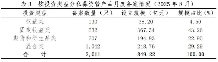 具体来看,混合类、固定收益类、期货和衍生品类、权益类,今年8月分别备案了1042只、632只、207只、130只,设立规模依次为248.76亿元、367.34亿元、194.63亿元、38.2亿元,规模占比分别为29.29%、43.26%、22.95%、4.5%。