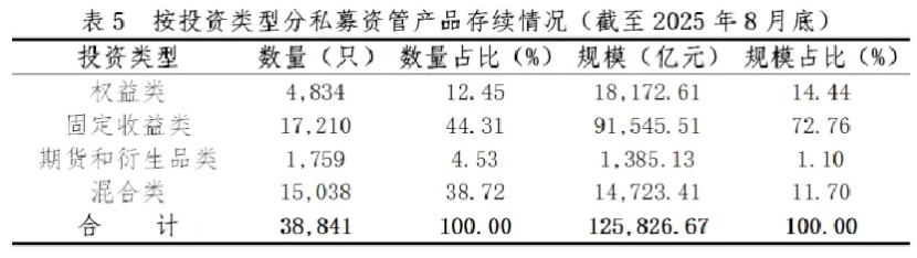 具体来看,截至8月底,固定收益类、混合类、权益类、期货和衍生品类产品数量分别为17210只、15038只、4834只、1759只,数量占比分别为44.31%、38.72%、12.45%、4.53%。