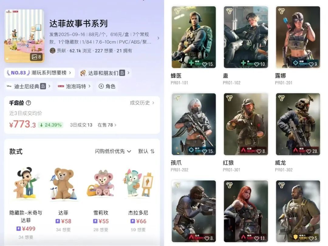 泡泡玛特和迪士尼联名(左)卡游和《三角洲行动》合作