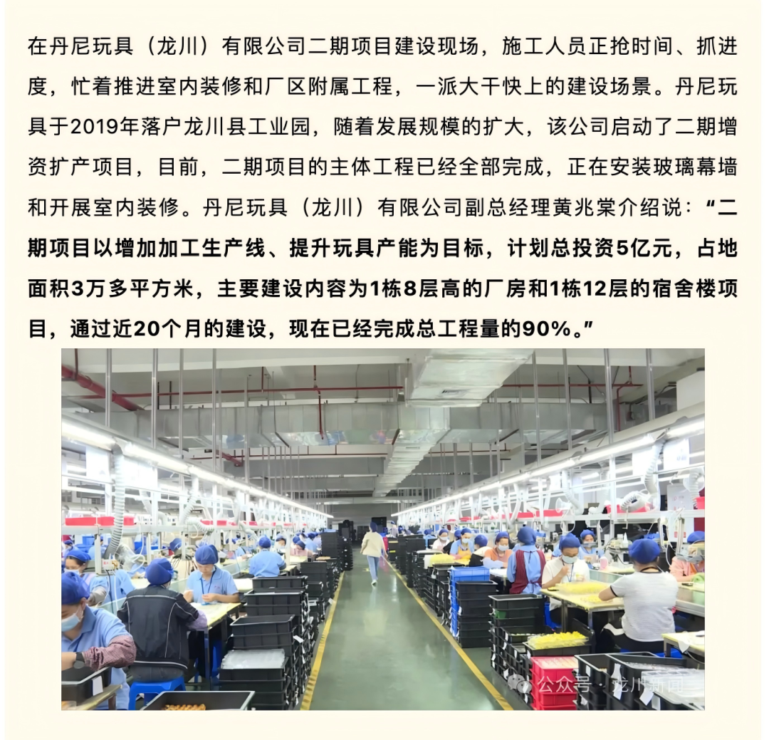 据龙川当地媒体报道,目前丹尼玩具(龙川)已启动了二期增资扩产项目,计划总投资5亿元,占地面积3万多平方米,预计年产塑胶电子玩具约1000万件、毛绒电子玩具约200万件。