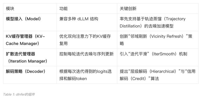 这种可插拔的架构,允许开发者像搭乐高一样,进一步组合和探索不同模块的优化策略,并在统一的平台上进行标准化评测 。更重要的是,dInfer 针对上述三大挑战,在每个模块中都集成了针对性的解决方案。