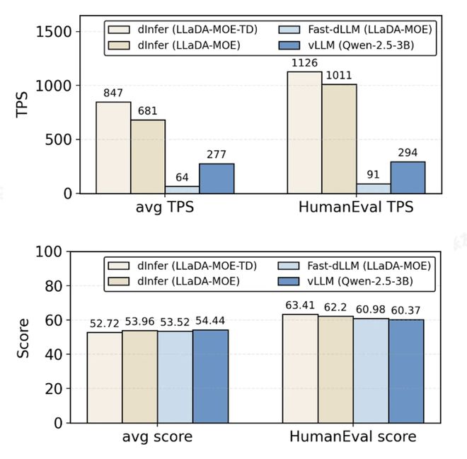在配备 8 块 NVIDIA H800 GPU 的节点上,dInfer 的性能表现令人瞩目。