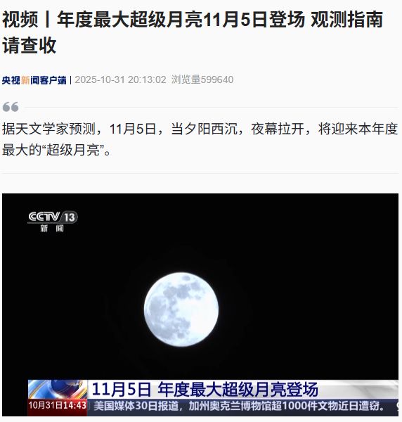 IT之家 11 月 2 日消息,据央视新闻报道,天文学家预测,11 月 5 日,当夕阳西沉,夜幕拉开,将迎来本年度最大的“超级月亮”。