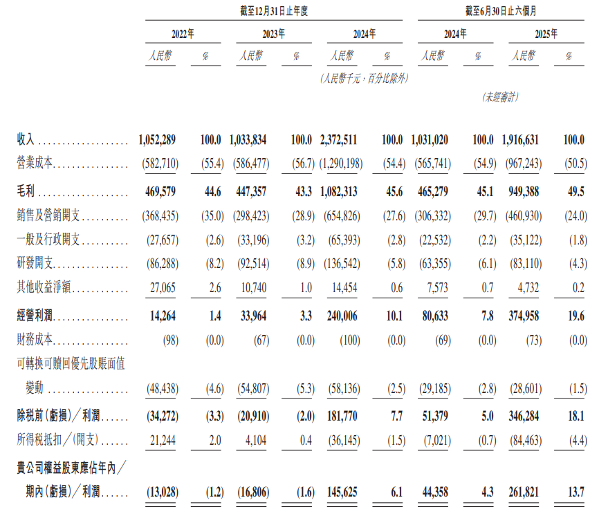 这一门生意令人意外。招股书披露,2022年至2024年及2025年上半年,米连科技分别实现收入10.52亿元、10.34亿元、23.73亿元及19.17亿元;同期毛利分别为4.70亿元、4.47亿元、10.82亿元及9.49亿元,毛利率为44.6%、43.3%、45.6%及49.5%。