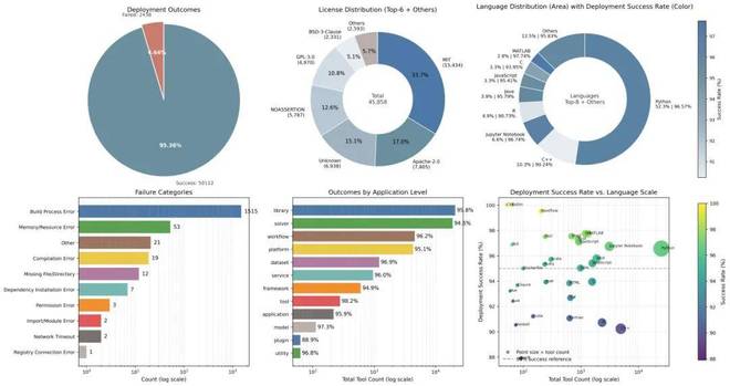 在成功部署的 50112 个工具中,我们观察到一个高度异构的语言分布。工具覆盖了 170 多种编程语言,其中 Python 占据了最大比例,其次是 C/C++、Notebook 形式的工具、R、Java 等。绝大部分语言部署成功率都稳定维持在较高水平。少数成功率相对较低的语言,主要集中在依赖复杂编译链或系统级库的场景,例如 C/C++、Fortran 以及部分 R 工具。