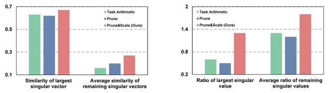 根据上述结论,成功的 PEFT 合并,关键在于保护低秩空间中每个奇异向量的方向。由于奇异值较大的方向更鲁棒,更不易被改变方向,故保护那些奇异值较小(但同样重要)的向量方向尤其重要,也是作者认为多任务性能下降的主要原因。