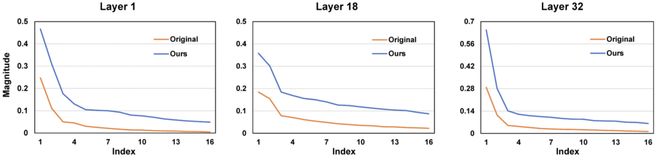 2. 奇异值分布的变化:作者展示了在不同层中矩阵奇异值分布的变化,发现所提出的方法可以很好地做到自适应缩放所有奇异值,同时使得更小的奇异值缩放倍数更多,达到增强方向鲁棒性的目的。