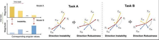 因此,可以得出,在 LoRA 合并的过程中,最重要的是维持方向稳定性。具体而言,由于数值更小,尾部奇异值的方向更加不鲁棒,需要通过某种方式维持其方向鲁棒性,进而增强多任务学习性能。