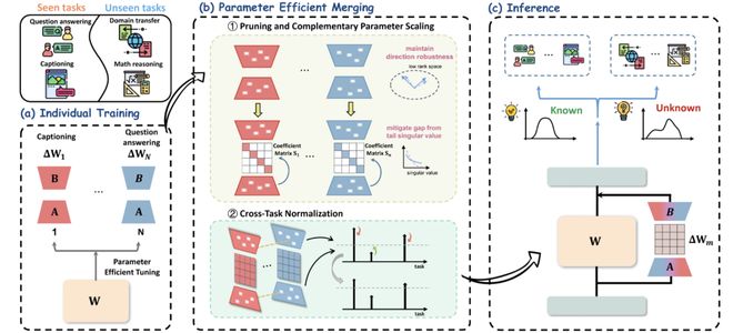 而由于 LoRA 模块参数的有限性,其通常只能适应某一个特定的下游领域。如果我们需要为每个任务训练一个专家模型,那么就会有一大堆针对不同任务微调出来的 LoRA 模块,个个都只能解答所在领域的问题。这就像拥有一个装满专业工具的箱子,但每次只能使用一件工具,这显然不是所希望的。
