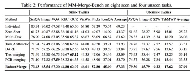 作者在多个基准上测试了 RobustMerge,同时自建了一个名为MM-MergeBench的基准来全面测试模型合并方法在多模态大模型上的性能,包含了 8 个已见任务(Seen Tasks,模型训练过的)和 4 个未见任务(Unseen Tasks,全新的挑战),覆盖了问答、分类、描述、推理等多种任务,同时验证已见任务的多任务性能和未见任务的泛化性能。
