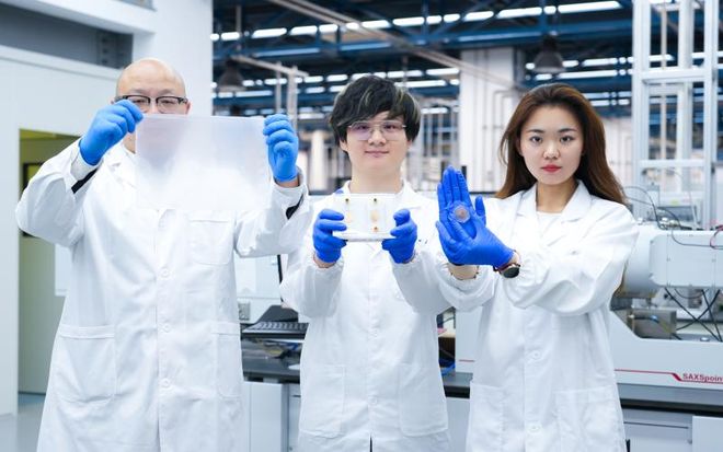 钱小石(左一)和学生一起展示高分子电卡薄膜,这也是登上《自然》的成果之一。