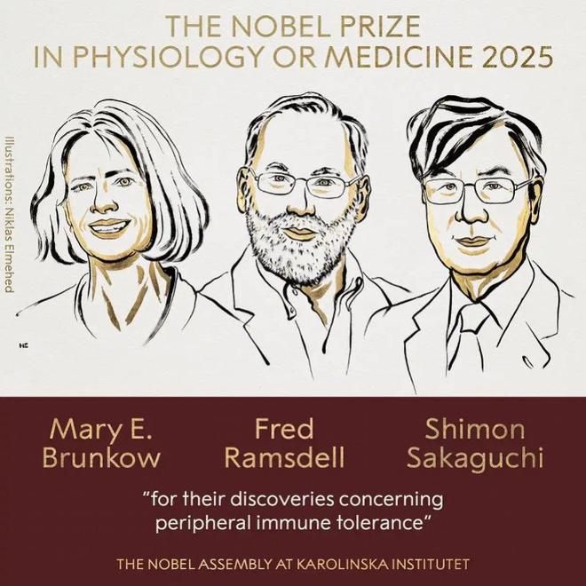 当地时间10月6日,瑞典卡罗琳医学院宣布,将2025年诺贝尔生理学或医学奖授予科学家玛丽·E·布伦科(Mary E. Brunkow)、弗雷德·拉姆斯德尔(Fred Ramsdell)和坂口志文(Shimon Sakaguchi),表彰他们在外周免疫耐受机制方面的研究贡献。获奖者将平分1100万瑞典克朗(约合832万元人民币)奖金。