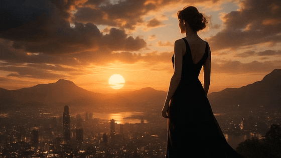 At golden hour, a brick tenement rooftop transforms into a small stage. Laundry lines strung with white sheets sway in the wind, catching the last rays of sunlight. Strings of mismatched fairy bulbs hum faintly overhead. A young woman in a flowing red silk dress dances barefoot, curls glowing in the fading light. Her partner — sleeves rolled, suspenders loose — claps along, his smile wide and unguarded. Below, the city hums with car horns, subway tremors, and distant laughter.