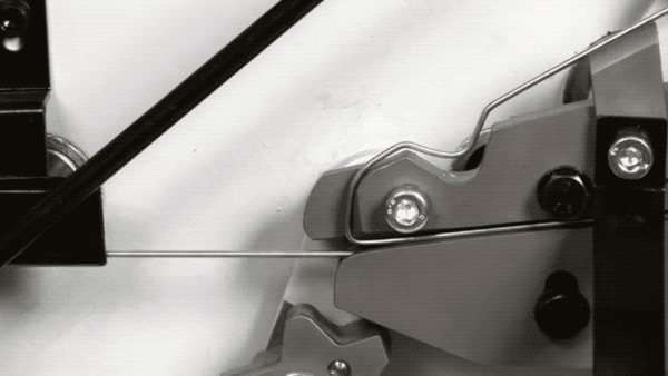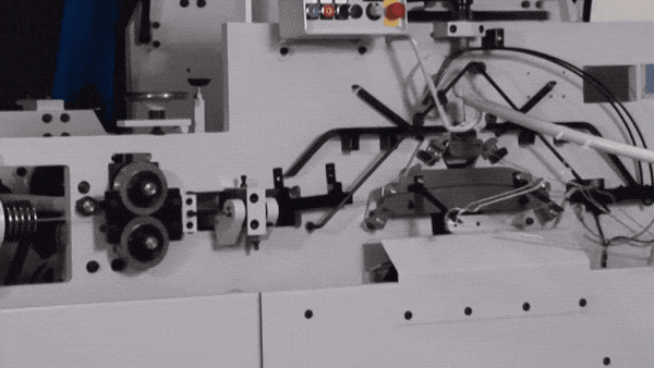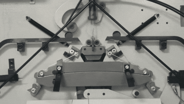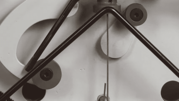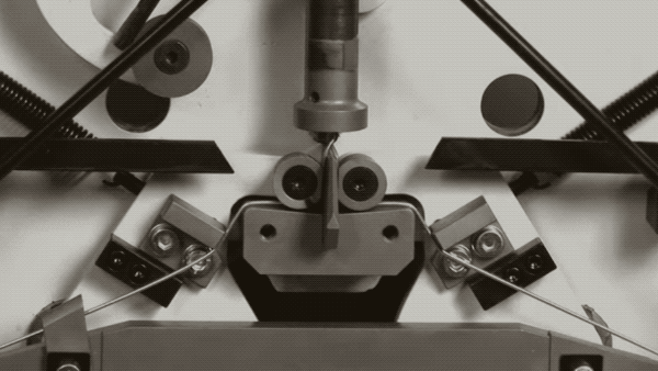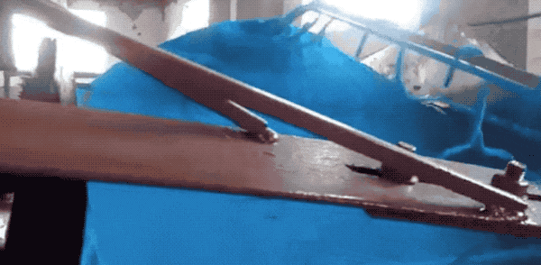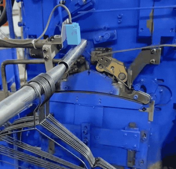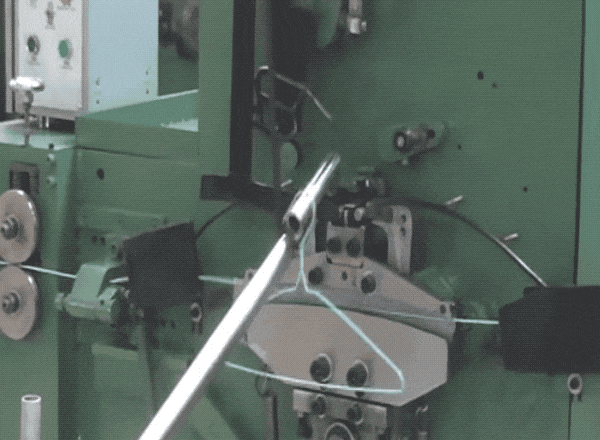 再分细节看:铁丝穿过去很长。而且是前一个衣架还在做造型时,后一根铁丝已经等待就位。侧边往上一弯折,有一个配合的成型模具把铁丝压入凹槽中,就形成了衣架臂。方便我们挂内衣、吊带衫的凹陷就是这么来的。