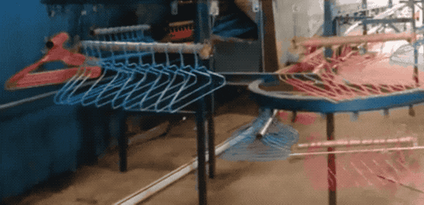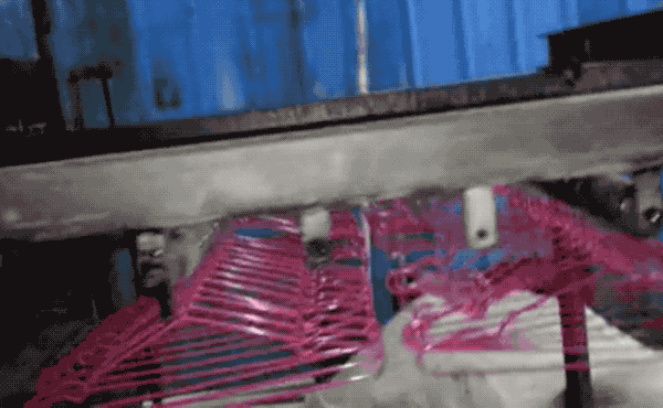 这里就要说说“粉末浸塑工艺”了。塑胶衣架主要由铁丝骨架和塑料涂层构成。液体浸塑工艺是让塑料先加热熔化去配合衣架,而粉末浸塑工艺则是让衣架先加热去配合塑料粉,你可以想象成铁丝衣架在塑料粉中打滚……(忍不住想到了驴打滚)。