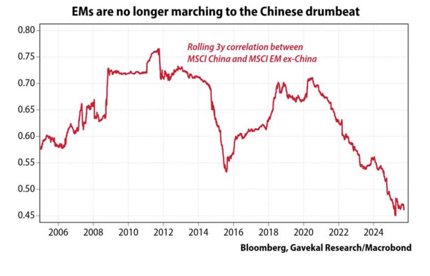 这一趋势始于2020年,至今持续了5年。2025年之前,新兴市场涨,中国跌,2025年至今,以印度为代表的新兴市场表现一般,中国却比较出色。