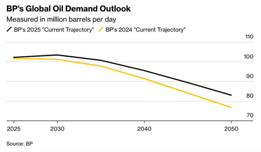 英国石油最近在其研报中预测到,全球石油的需求峰值,可能从此前预测的2025年推迟到2030年。最新的预测显示,相较于之前,未来每年的需求上调接近800万桶。