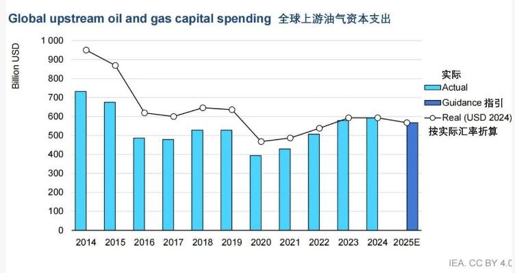 需求上调的同时,全球石油产业资本却在下降。IEA的数据显示,2025年,全球上游油气投资预计下降4%,其中石油投资减少6%,天然气投资增加3%。