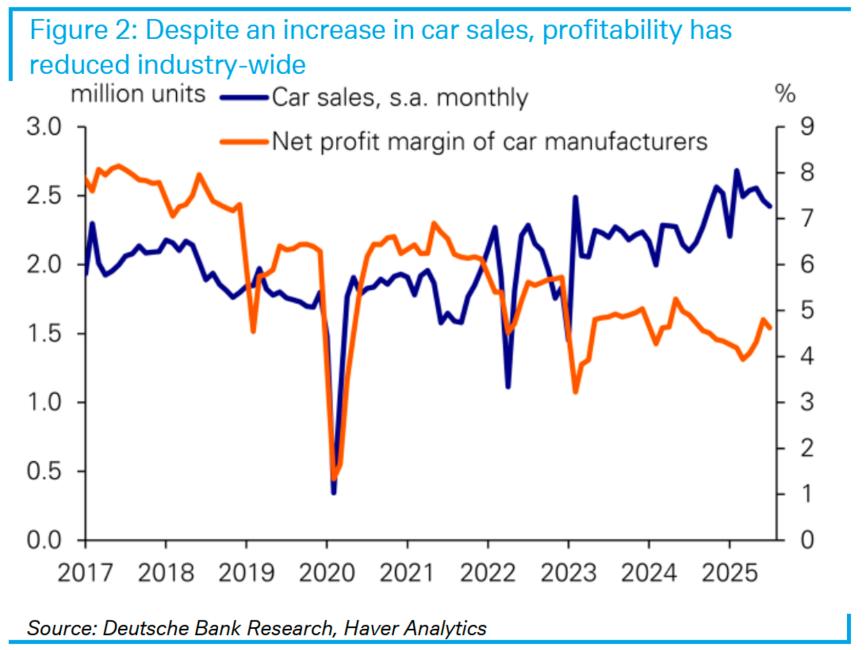 据德银的统计,从2017年到2024年,中国汽车行业的总销量增长了21%,但总利润却下降了33%,净利润率也从8%降至4.3%。