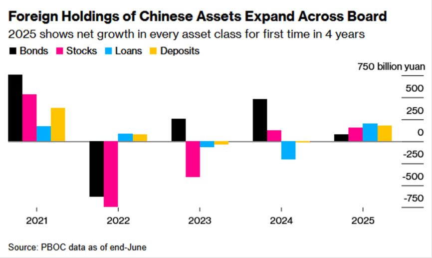外资的态度也说明这一点。据彭博的统计,2025年全球投资者正大规模重返中国市场,无论股票、债券、贷款还是存款,均出现净流入。