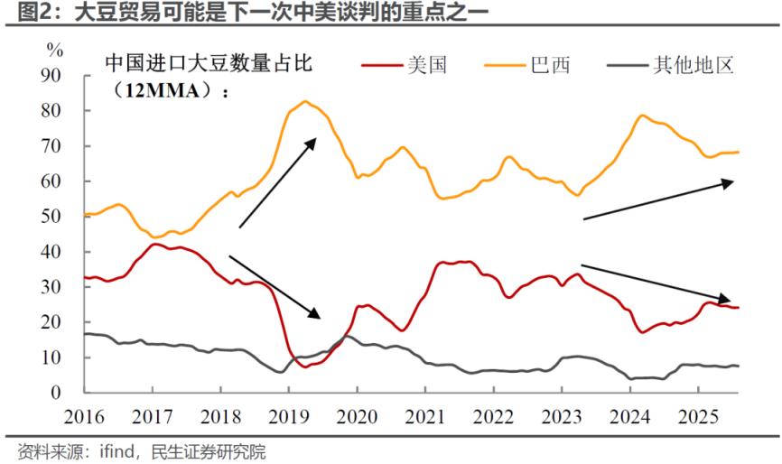 另据民生证券的统计,自从老川上台以后,中国进口大豆的国别整体呈现出去美化特征,巴西等地的进口占比一直处于7成以上的地位。