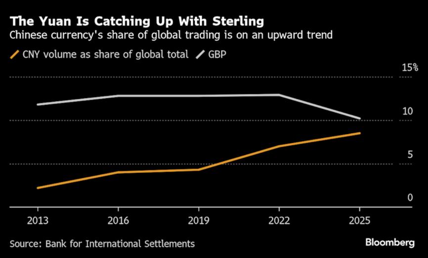 这背后,是英镑等货币份额的下降。据统计,从2022年到2025年,英镑份额从12.9%降至10.2%。人民币和英镑之差的份额差距,还剩1.7%。