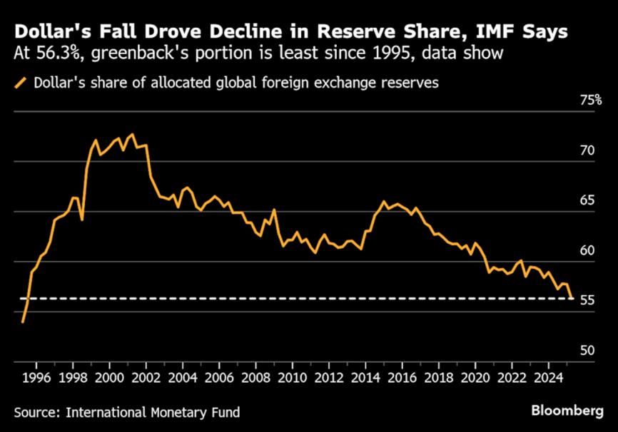 中国资产收到追捧,而美元资产正遭遇30年来最大的烦恼。据IMF统计,截止2025年第二季度,美元在全球外汇储备中的名义占比下滑至56.3%,创下自1995年以来的最低水平。