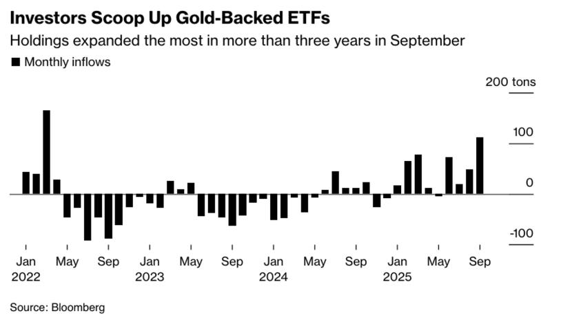 据彭博统计,9月份,全球流入黄金ETF的资金量,创下三年多以来的最高纪录。黄金ETF提供了金价上涨46%的驱动力,堪称核心动力。