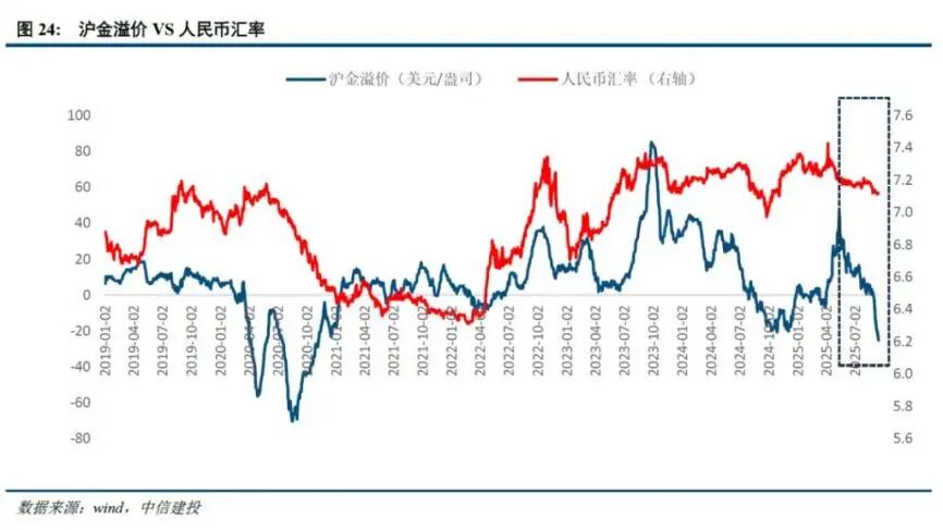 据中信建投的统计,2025年6月以来,沪金溢价水平在回落,8月开始甚至出现负值,截止9月份,创2021年以来新低。这说明,欧美国家开始追捧,而亚洲市场开始恐高。