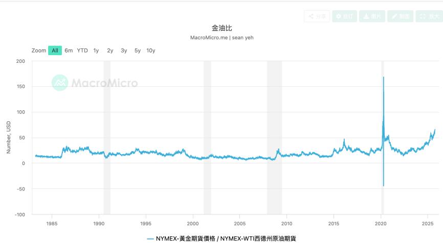 金油比长期建稳定在十几到二十几,但2024年底以来,金油之比不断突破历史极值,朝着史上罕见的高度不断攀升。